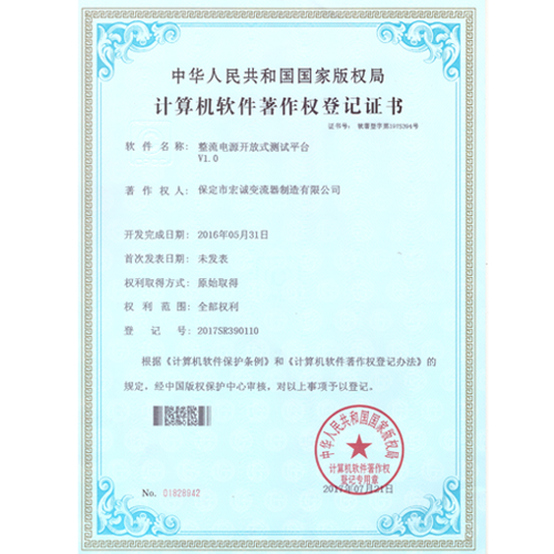 計(jì)算機(jī)軟件注冊(cè)權(quán)登記證書(shū)——整流電源開(kāi)放式測(cè)試平臺(tái)V1.0