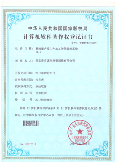 計(jì)算機(jī)軟件注冊(cè)權(quán)登記證書(shū)——整流器產(chǎn)品生產(chǎn)加工智能管理系統(tǒng)V1.0
