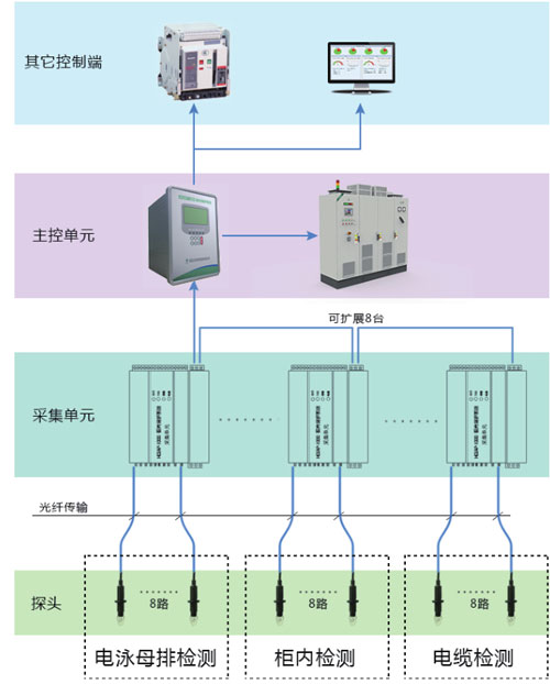一個(gè)主控單元能同時(shí)保護(hù)幾個(gè)檢測(cè)區(qū)域,因此弧光微機(jī)監(jiān)控系統(tǒng)的采集單元可以分散到不同的位置,把檢測(cè)到的弧光信號(hào)傳送到主控單元。